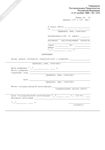 Заявление о выдаче повторного свидетельства о рождении (форма № 18)