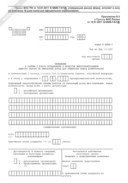 Заявление о снятии с учета организации в качестве налогоплательщика единого налога на вмененный доход для отдельных видов деятельности. Форма № ЕНВД-3 (рекомендуемый образец заполнения)