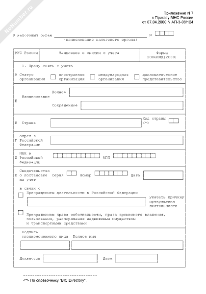 Заявление о снятии с учета. Форма № 2006ИМД(2000)