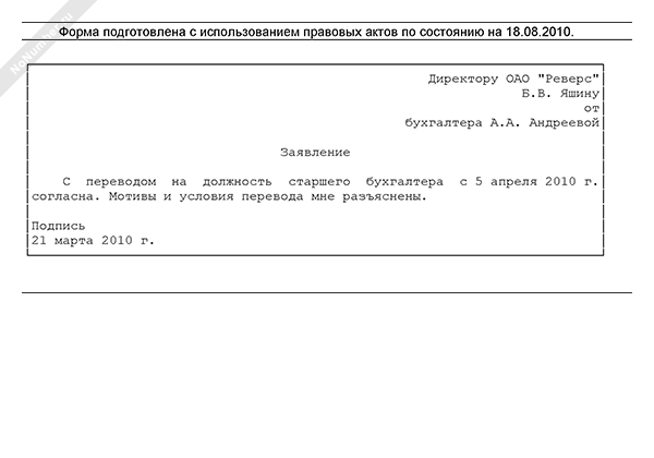Заявление работника о согласии на перевод на другую должность (рекомендуемый образец заполнения)