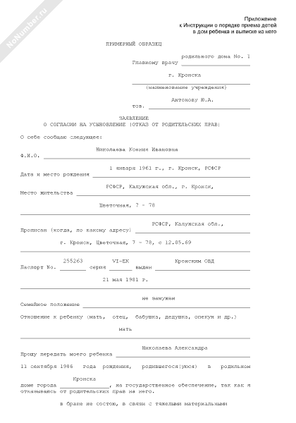 Заявление о согласии на усыновление (отказ от родительских прав)