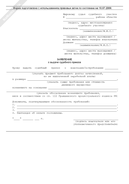 Заявление о выдаче судебного приказа (рекомендуемый образец заполнения)
