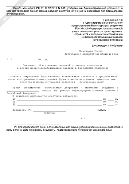 Заявление об исключении сведений о заводе, включенном в реестр нефтеперерабатывающих заводов в Российской Федерации (рекомендуемый образец заполнения)