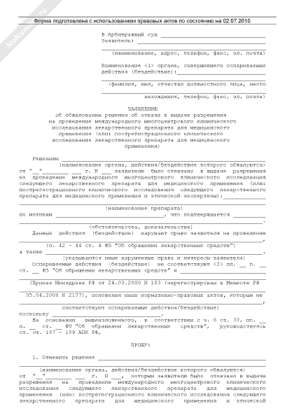 Заявление в арбитражный суд об обжаловании решения об отказе в выдаче разрешения на проведение международного многоцентрового клинического исследования лекарственного препарата для медицинского применения или пострегистрационного клинического исследования лекарственного препарата для медицинского применения (рекомендуемый образец заполнения)