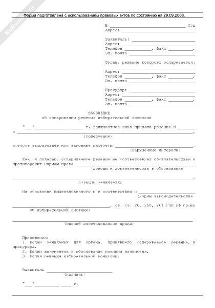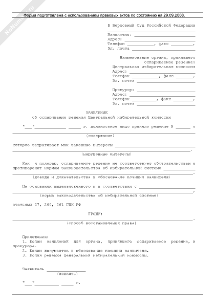 Заявление об оспаривании решения Центральной избирательной комиссии