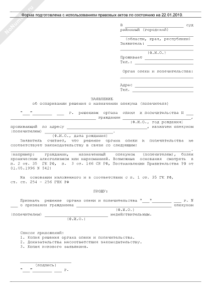 Заявление об оспаривании решения о назначении опекуна (попечителя)