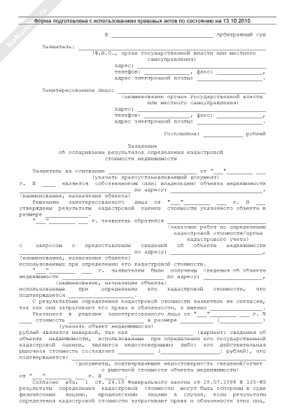 Заявление в арбитражный суд об оспаривании результатов определения кадастровой стоимости объекта недвижимости (рекомендуемый образец заполнения)