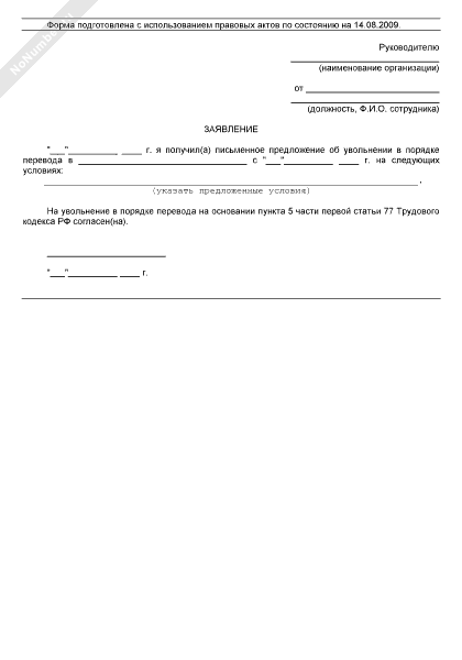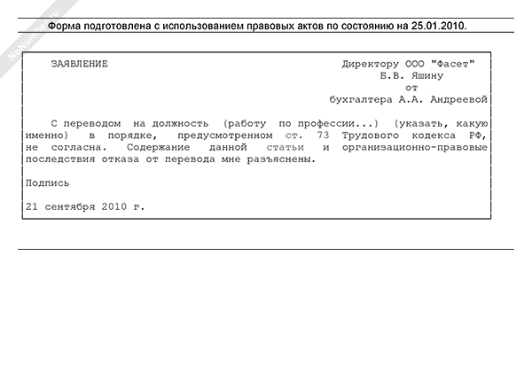 Заявление об отказе работника на перевод на другую должность в соответствии с медицинским заключением (рекомендуемый образец заполнения)