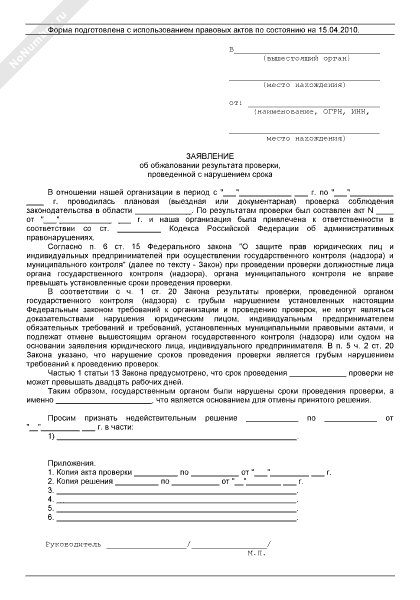 Заявление в вышестоящий орган об отмене решения органа государственного (муниципального) контроля, принятого по результатам плановой проверки, проведенной с нарушением срока