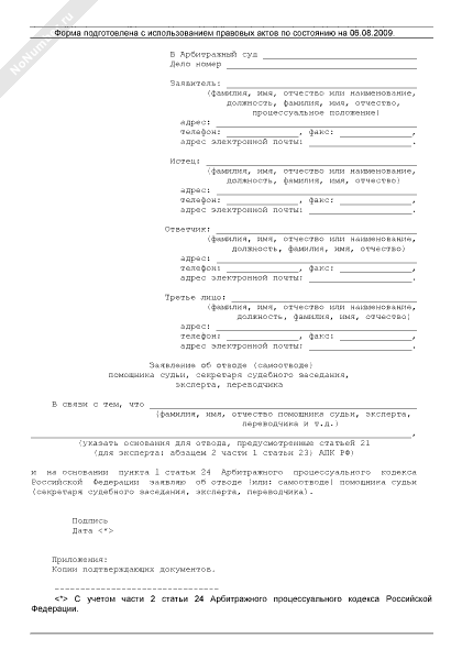 Заявление в арбитражный суд об отводе (самоотводе) помощника судьи, секретаря судебного заседания, эксперта, переводчика