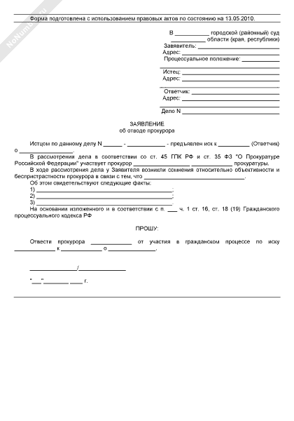 Заявление в суд общей юрисдикции об отводе (самоотводе) прокурора от участия в гражданском процессе