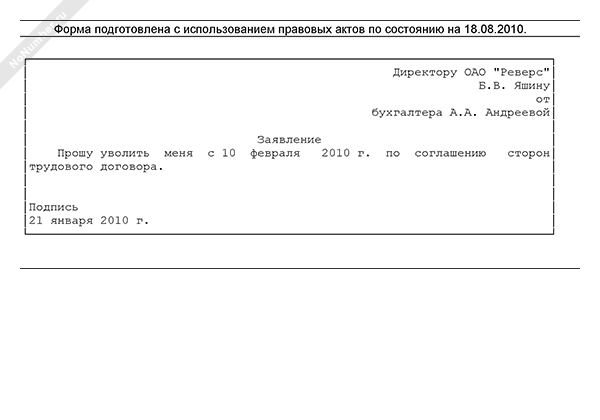 Заявление работника об увольнении по соглашению сторон (рекомендуемый образец заполнения)
