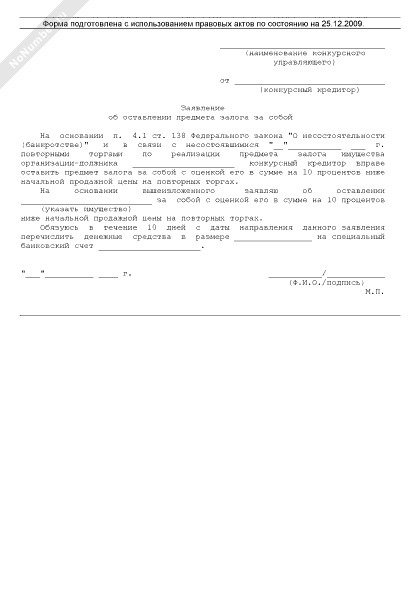 Заявление конкурсного кредитора об оставлении предмета залога за собой