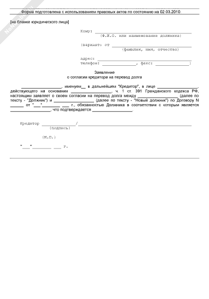 Заявление о согласии кредитора на перевод долга