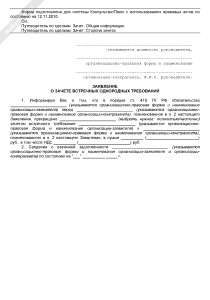Заявление о зачете встречных однородных требований