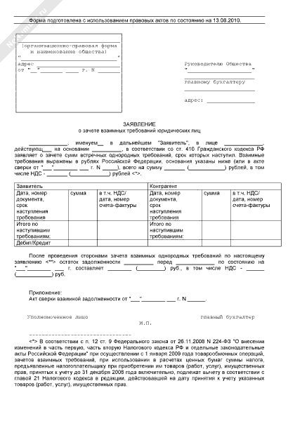 Заявление о зачете взаимных требований юридических лиц