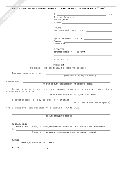 Заявление об изменении предмета исковых требований