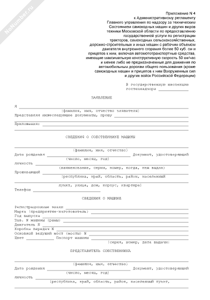 Заявление в государственную инспекцию по надзору за техническим состоянием самоходных машин и других видов техники Московской области от физического лица — собственника машины (представителя собственника) о регистрации машины