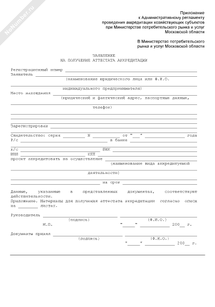 Заявление в Министерство потребительского рынка и услуг Московской области на получение аттестата аккредитации (рекомендуемый образец заполнения)