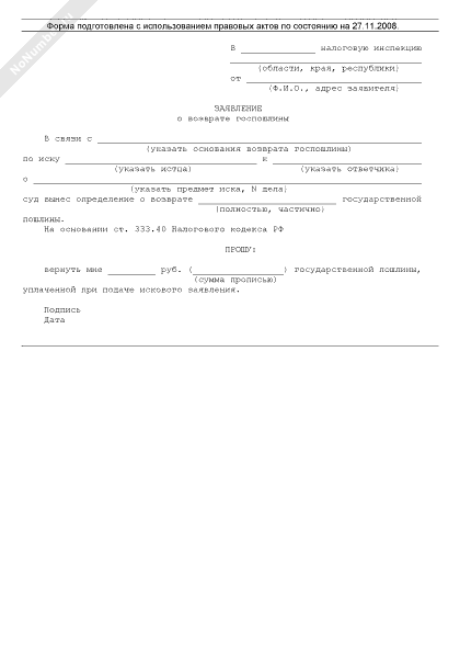 Заявление в налоговую инспекцию о возврате государственной пошлины, уплаченной при подаче искового заявления (рекомендуемый образец заполнения)