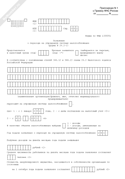 Заявление о переходе на упрощенную систему налогообложения. Форма № 26.2-1