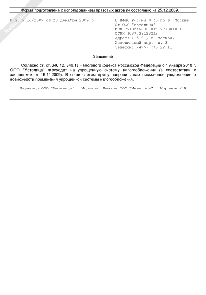 Заявление в налоговый орган о переходе организации на упрощенную систему налогообложения (УСНО) (рекомендуемый образец заполнения)