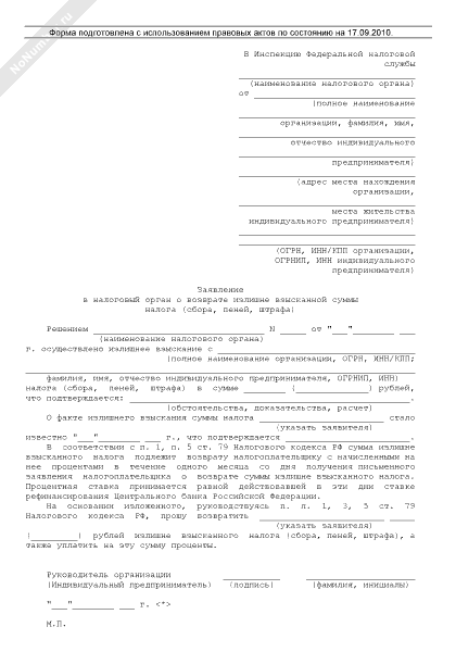 Заявление в налоговый орган о возврате излишне взысканной суммы налога (сбора, пеней, штрафа)