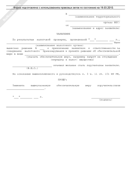 Заявление в налоговый орган о замене обеспечительных мер поручительством (рекомендуемый образец заполнения)