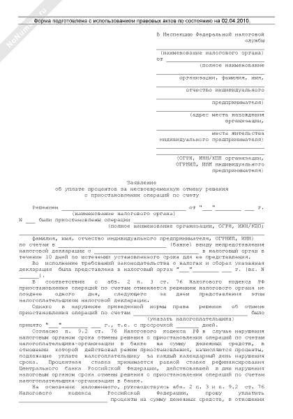 Заявление в налоговый орган об уплате процентов за несвоевременную отмену решения о приостановлении операций по счету (рекомендуемый образец заполнения)