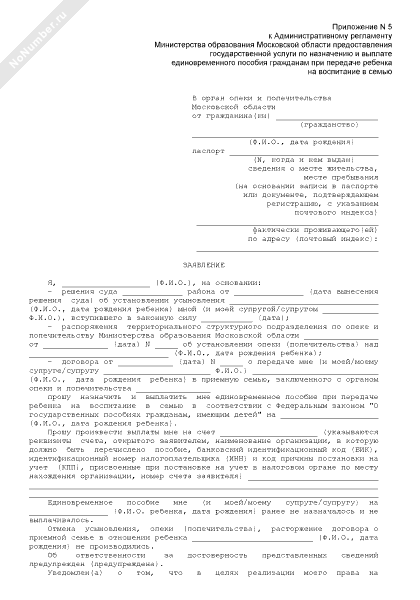 Заявление в орган опеки и попечительства Московской области о назначении и выплате единовременного пособия при передаче ребенка на воспитание в семью (рекомендуемый образец заполнения)