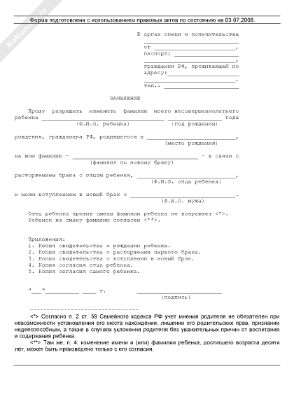 Заявление в органы опеки и попечительства о смене фамилии ребенка (от матери)