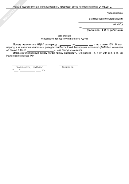 Заявление работника работодателю о возврате излишне уплаченного НДФЛ