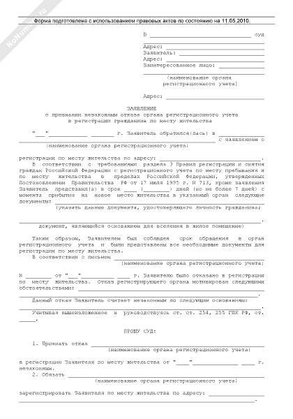 Заявление в суд общей юрисдикции о признании незаконным отказа органа регистрационного учета в регистрации гражданина по месту жительства и обязании осуществить регистрацию (рекомендуемый образец заполнения)
