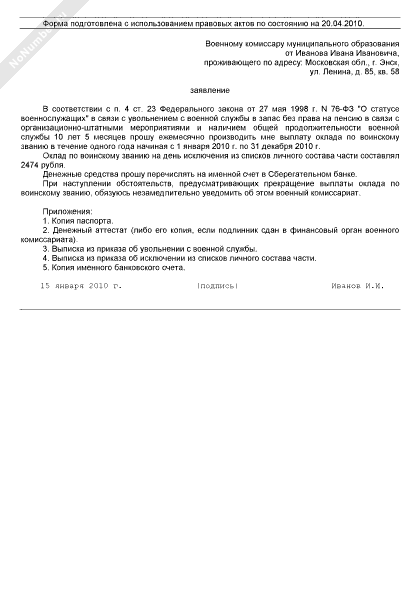 Заявление в военный комиссариат для получения оклада по воинскому званию связи с увольнением с военной службы в запас без права на пенсию (рекомендуемый образец заполнения)