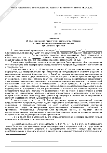 Заявление в вышестоящий орган об отмене решения, принятого органом государственного (муниципального) контроля по результатам проверки, в связи с непредъявлением проверенному субъекту акта проверки