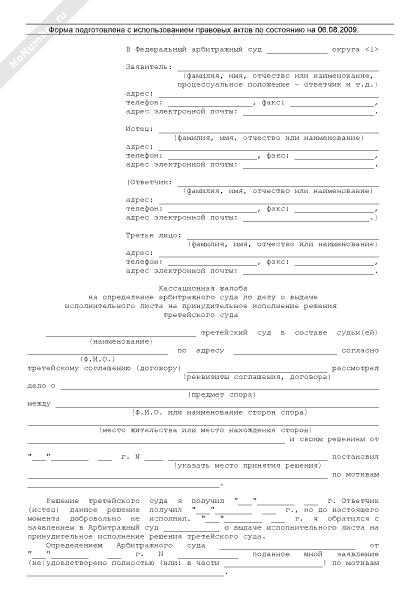 - 155Кассационная жалоба на определение арбитражного суда по делу о выдаче исполнительного листа на принудительное исполнение решения третейского суда