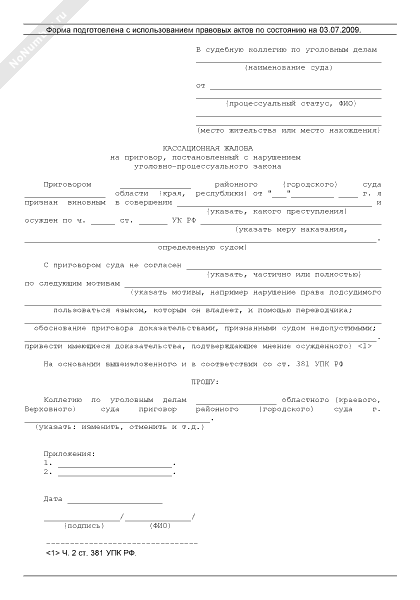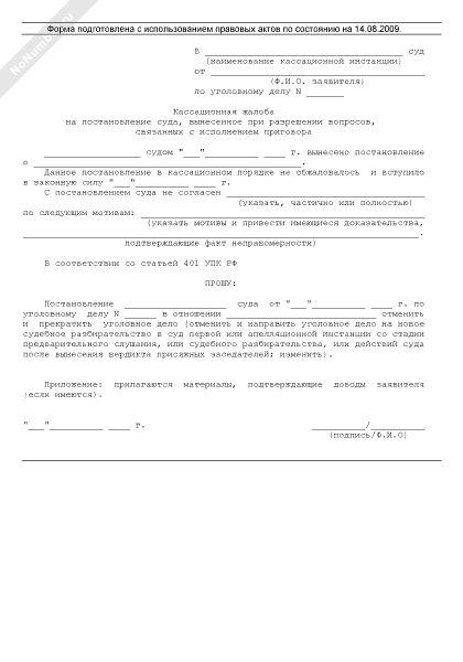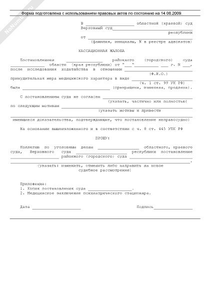 - 150Кассационная жалоба на постановление суда об освобождении лица, совершившего преступление в состоянии невменяемости, или лица, у которого после совершения преступления наступило психическое расстройство, от уголовной ответственности или от наказания и о применении к нему принудительных мер медицинского характера