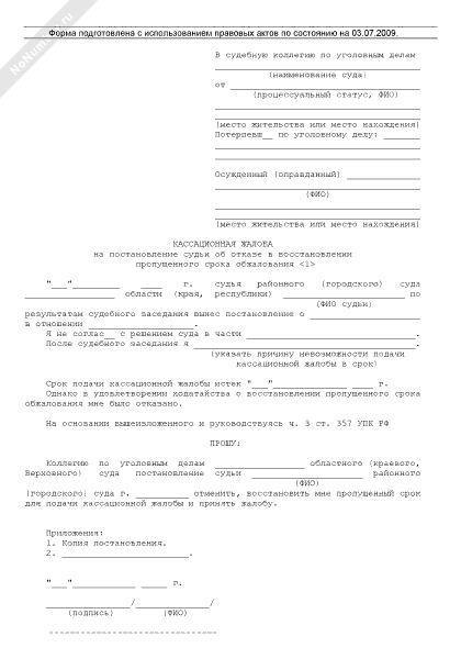 - 145Кассационная жалоба на постановление судьи об отказе в восстановлении пропущенного срока обжалования