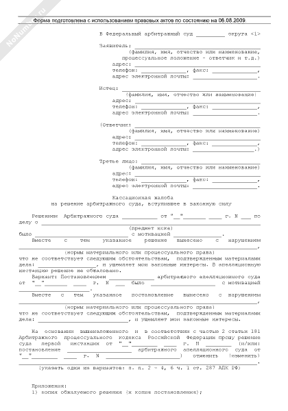 - 154Кассационная жалоба на решение арбитражного суда, вступившее в законную силу
