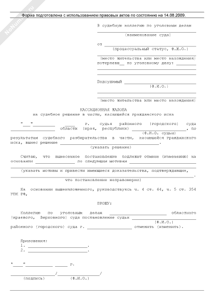 - 149Кассационная жалоба на судебное решение по уголовному делу в части, касающейся гражданского иска