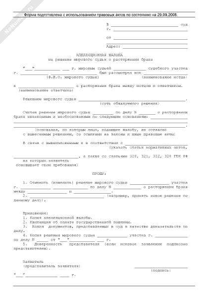 Апелляционная жалоба на решение мирового судьи о расторжении брака (рекомендуемый образец заполнения)