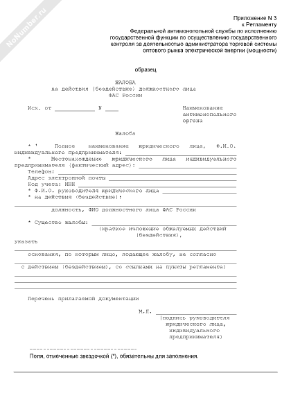 Жалоба на действия (бездействие) должностного лица Федеральной антимонопольной службы России по исполнению государственной функции по осуществлению контроля за деятельностью администратора торговой системы оптового рынка электрической энергии (мощности) (рекомендуемый образец заполнения)