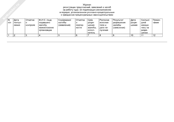 - 502Журнал регистрации предложений, заявлений и жалоб на работу суда, не подлежащих рассмотрению в порядке, установленном уголовно-процессуальным и гражданско-процессуальным законодательством (форма № 23)