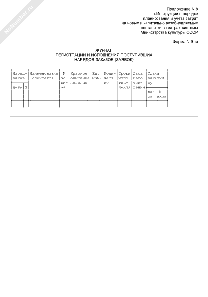 - 560Журнал регистрации и исполнения поступивших нарядов-заказов (заявок) для театральной постановки. Форма № 9-тз