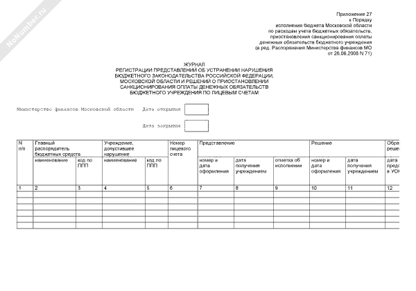 - 547Журнал регистрации представлений об устранении нарушения бюджетного законодательства Российской Федерации, Московской области и решений о приостановлении санкционирования оплаты денежных обязательств бюджетного учреждения по лицевым счетам