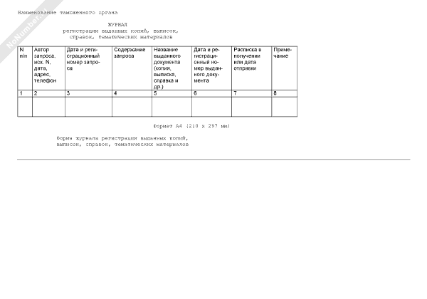 - 552Журнал регистрации выданных копий, выписок, справок, тематических материалов из архива таможенного органа