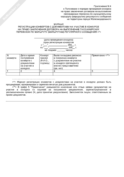 - 598Журнал регистрации конвертов с документами на участие в конкурсе на право заключения договора на выполнение пассажирских перевозок по маршруту (маршрутам) регулярного сообщения на территории города Железнодорожного Московской области