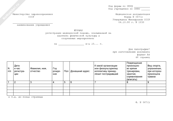 - 584Журнал регистрации медицинской помощи, оказываемой на занятиях физической культуры и спортивных мероприятиях. Форма № 067/у