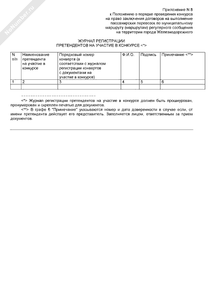 - 599Журнал регистрации претендентов на участие в конкурсе на право заключения договора на выполнение пассажирских перевозок по маршруту (маршрутам) регулярного сообщения на территории города Железнодорожного Московской области
