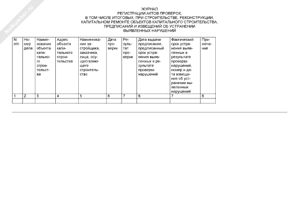 - 665Журнал регистрации актов проверок, в том числе итоговых, при строительстве, реконструкции, капитальном ремонте объектов капитального строительства, предписаний и извещений об устранении выявленных нарушений
